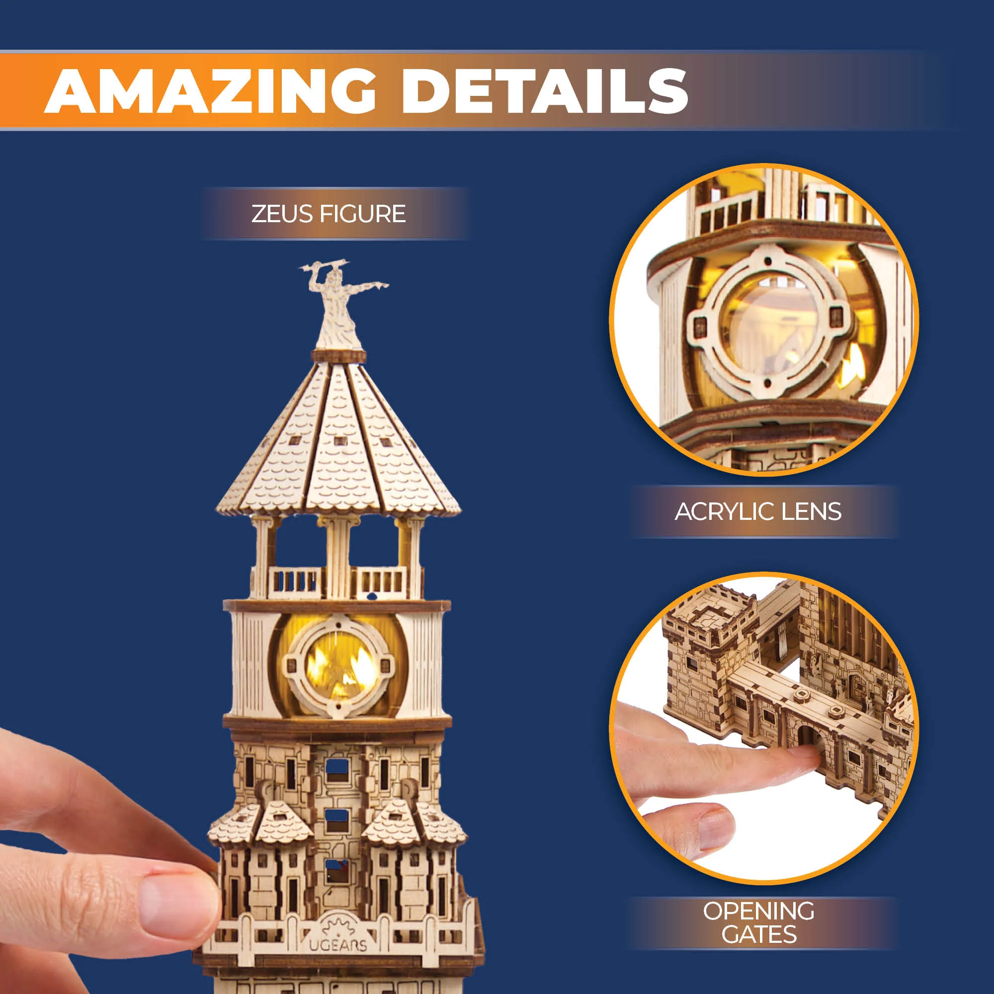 Tee‑se‑itse‑puumalli Faroksen majakasta perustuu pitkälti säilyneisiin historiallisiin lähteisiin, joten kyseessä on kiehtova, valmiiksi koottava pienoismalli. Koska Faroksen majakka omistettiin Zeusille, mallin huipulla on ukkosenjumalaa kuvaava kaiverrettu siluetti, jossa hän pitelee salamaa. Muureihin, torneihin, kulkusiltaan ja kupoliin on lisätty arkkitehtonisia yksityiskohtia, ja laserkaiverrus jäljittelee kivipaasien ja kattotiilien pintaa. Ugearsille ominaiseen tapaan staattisessa mallissa on myös liikkuva elementti: etu- ja takapuolella sijaitsevat portit avautuvat kiertämällä nuppeja.